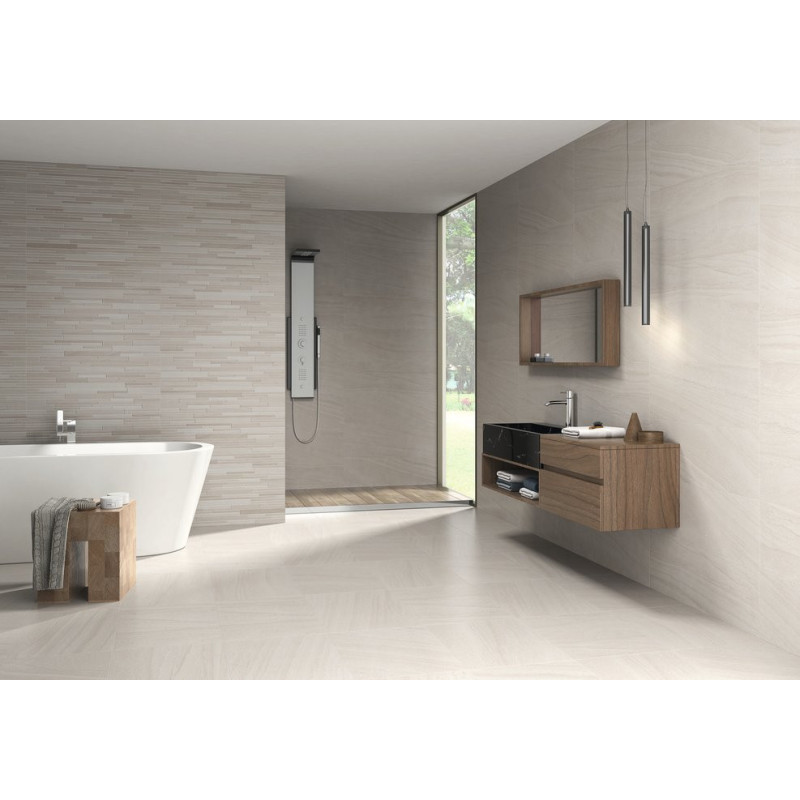 El revestiment està fabricat en pasta blanca, amb un acabat mat, rectificat i amb relleu. Per la seva banda, el paviment està fet de porcelànic, oferint resistència a les gelades i un disseny destonificat de variació V1. Els dos formats compten amb impressió digital d'alta definició, cosa que assegura detalls realistes i una estètica natural.