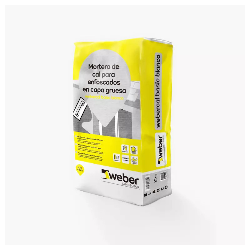 Webercal Basic de la marca WEBER es un mortero mineral de cal con conglomerantes hidráulicos, diseñado para la creación de enfoscados en capa gruesa. Este producto es ideal como base en soluciones bicapa, especialmente en combinaciones con revestimientos de acabado como revocos o estucos, ofreciendo versatilidad y alta calidad en proyectos de construcción y restauración. Es compatible con una amplia variedad de soportes, incluyendo hormigón, morteros de cemento y cal, ladrillos y bloques de hormigón.
