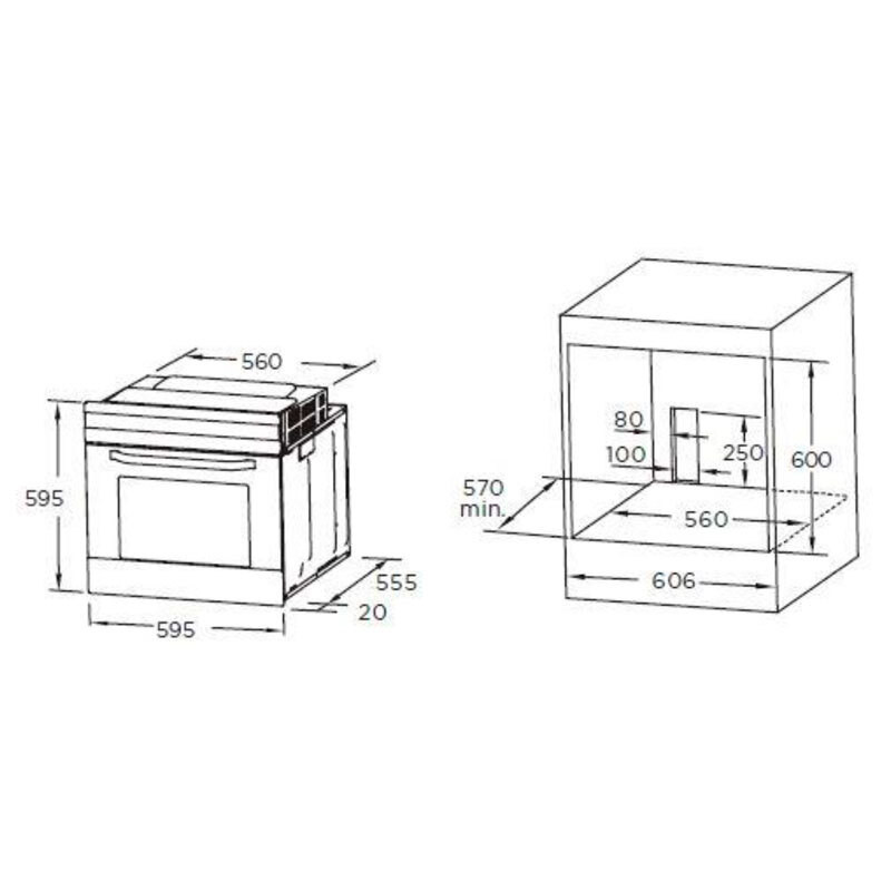 Equipa dos mandos fijos de fácil uso, ventilador tangencial para distribución homogénea del calor, iluminación interior y puerta con doble cristal, lo que facilita una visión clara de los alimentos mientras se cocinan. Su instalación requiere un hueco estándar de 60×56×57 cm, y las dimensiones externas son 595×595×575 mm, adecuándose a la mayoría de mobiliario de cocina.
