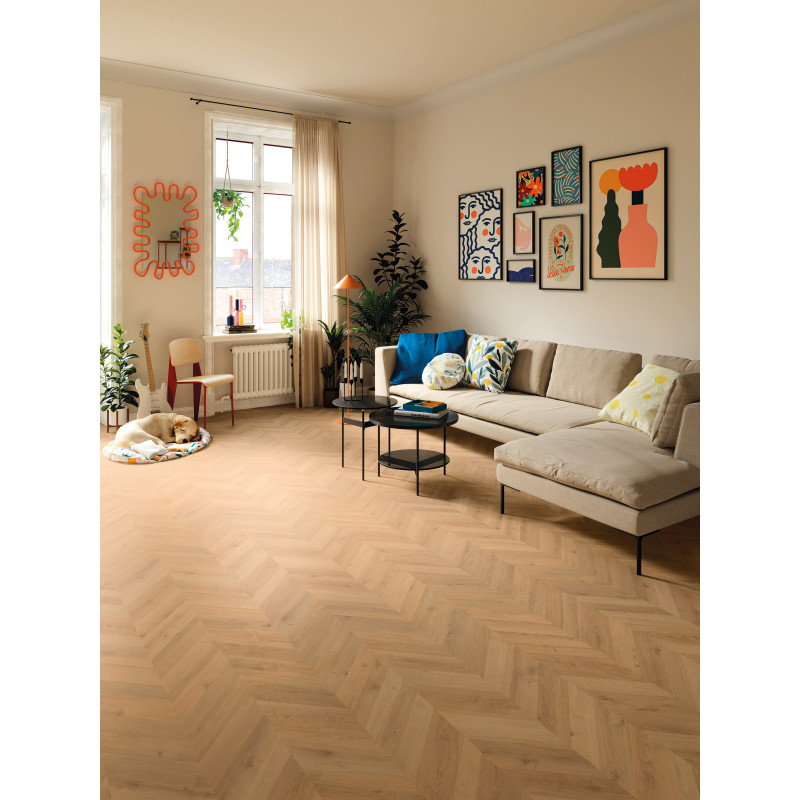 El suelo laminado 281B Espiga Dijon de Finfloor es la combinación perfecta de diseño sofisticado y funcionalidad excepcional. Su patrón en espiga, realzado por el tono natural dorado del roble y el acabado Vintage Matt, aporta calidez y elegancia a cualquier espacio. Diseñado con el formato SUPREME de 24 cm de ancho, imita la autenticidad del tablón de madera maciza, pero con las ventajas de un suelo laminado moderno.