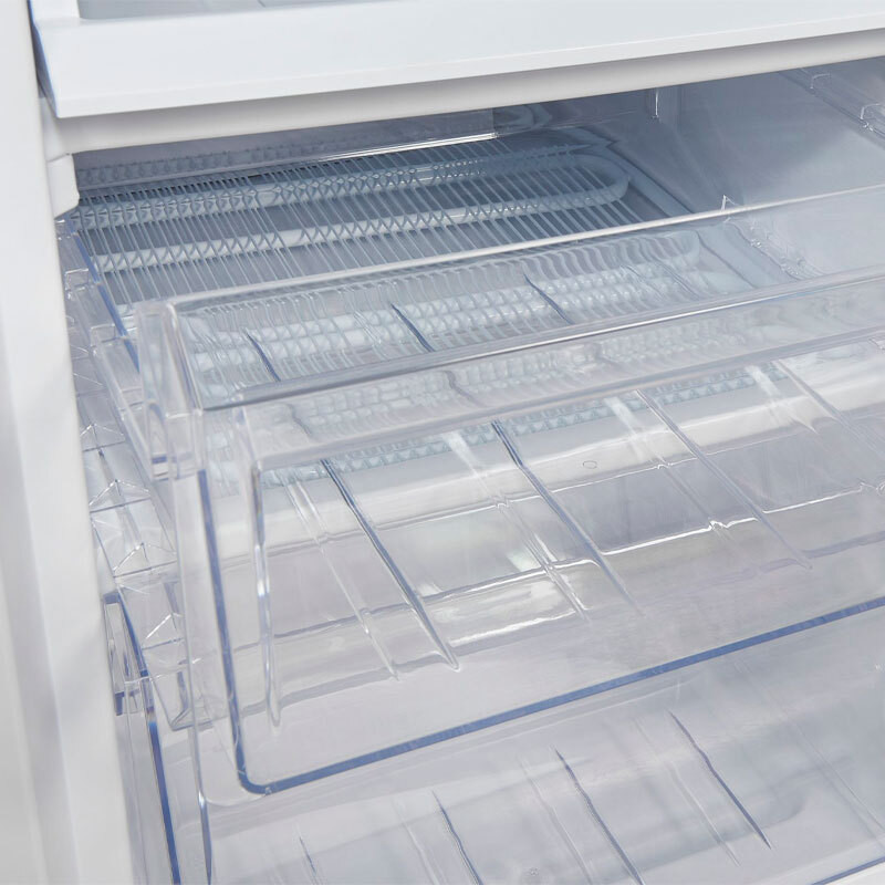 Este combi de libre instalación incluye un cajón verdulero para conservar frutas y verduras, tres estantes de cristal (dos regulables), iluminación interior LED y bandejas en la puerta, ofreciendo un diseño funcional y elegante. El congelador está equipado con dos cajones, una bandeja extraíble, descongelación automática y una autonomía de 7 horas en caso de corte eléctrico.